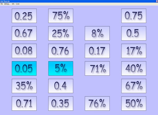 Here you can see Pair Them Up being played by a single player whilst showing all the cards. This allows for practice without having to guess and remember. When the game is finished, the time taken and the number of moves is displayed. The highlight colour and background colour can be selected in the settins panel.