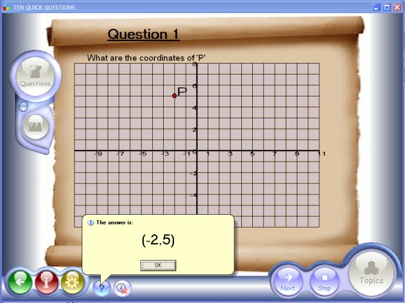 Here you can see 10 quick questions pro in it's default mode. The backgound is set to the default scroll and the control bar buttons - Play,Stop and Topic are on the right of the bar. You can also see here one of the new features in the pro version, the abiity to be able to display the answer to any question at any time and not to have to wait untill the 10 questions have finished.
